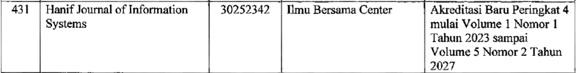 We are pleased to announce that Hanif Journal of Information Systems has successfully achieved Rank 4 Accreditation (SINTA 4), effective from Volume 1 Number 1 (2023) through Volume 5 Number 2 (2027). Further information can be found at the following link: